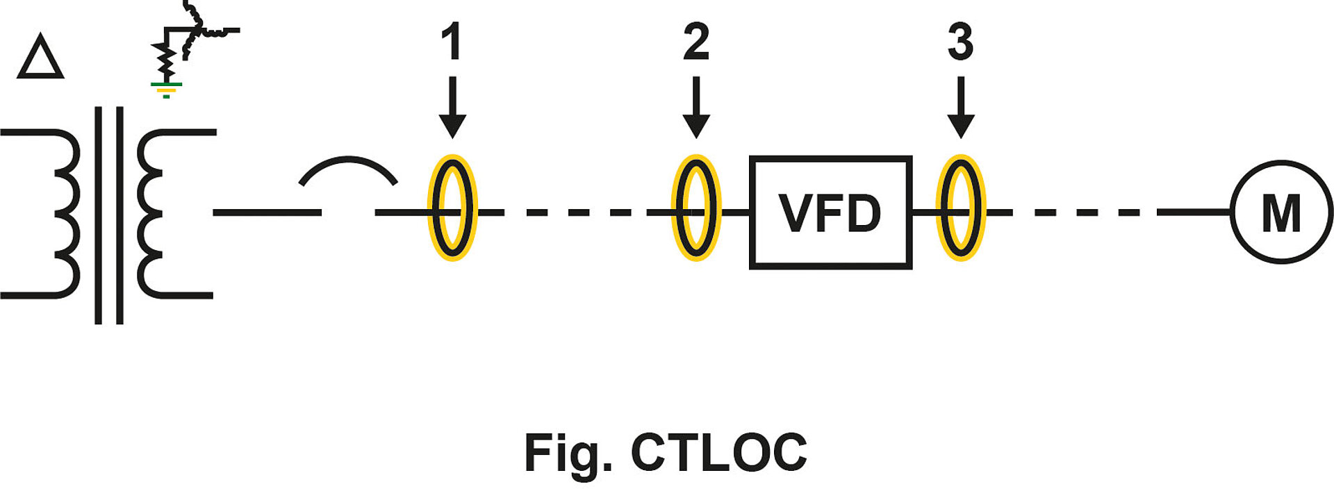 A core-balance zero-sequence current transformer (ZSCT), connected to a residual-current monitor, can be used to detect a ground fault in the drive, cabling, and motor. The zone of protection is downstream (load side) of the CT. If installed at the supply motor control center (location 1 in the figure), a ground fault in the motor and the cable between the motor and drive will also be detected.